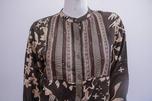 Brown Printed Button-Down Shirt – Earthy Tones with Artisan Detailing Add a touch of contemporary ethnic elegance to your wardrobe with this brown printed shirt, thoughtfully designed with rich earthy tones and intricate detailing. The kurta features an all-over abstract leaf-inspired print in warm beige hues, creating a bold yet...