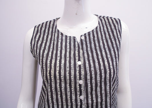 Black -stripe-cotton-sleeveless-short-top A classic cotton short top featuring timeless indigo stripe prints.Designed with a sleeveless outer layer and attached inner sleeves for comfort.An easy, breathable top perfect for everyday and office-casual wear. Product Details Color: Black Length : 26"Inch Fabric: Pure CottonStyle: Sleeveless Short Top with Inner SleevesNeckline: Round neck with...