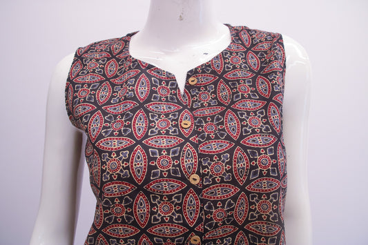 Printed Cotton Sleeveless Short Top A stylish cotton sleeveless short top featuring elegant all-over prints.Designed with front button detailing for a neat, versatile look.Lightweight and breathable, perfect for daily and casual wear. Product Details Color: Charcoal Grey with Maroon Prints Length : 26"Inch Fabric: Pure CottonStyle: Sleeveless Short Top with Inner...
