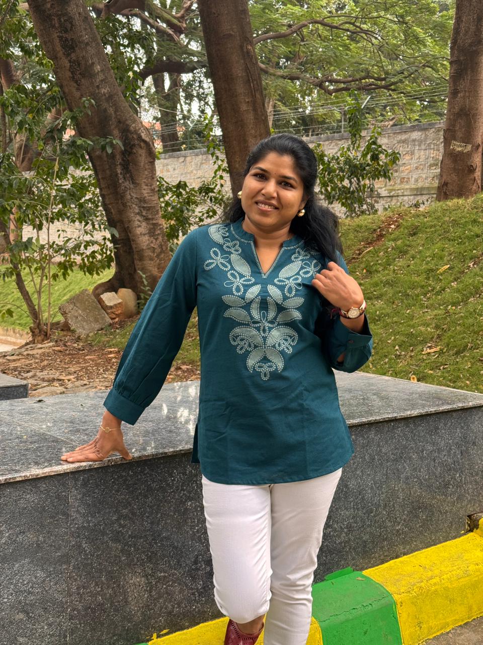 The soothing blue hue adds a calm yet stylish vibe, while the short‑top silhouette makes it easy to pair with jeans, palazzos, or skirts. Simple yet versatile, this piece is a must‑have for those who love understated fashion with a touch of charm.