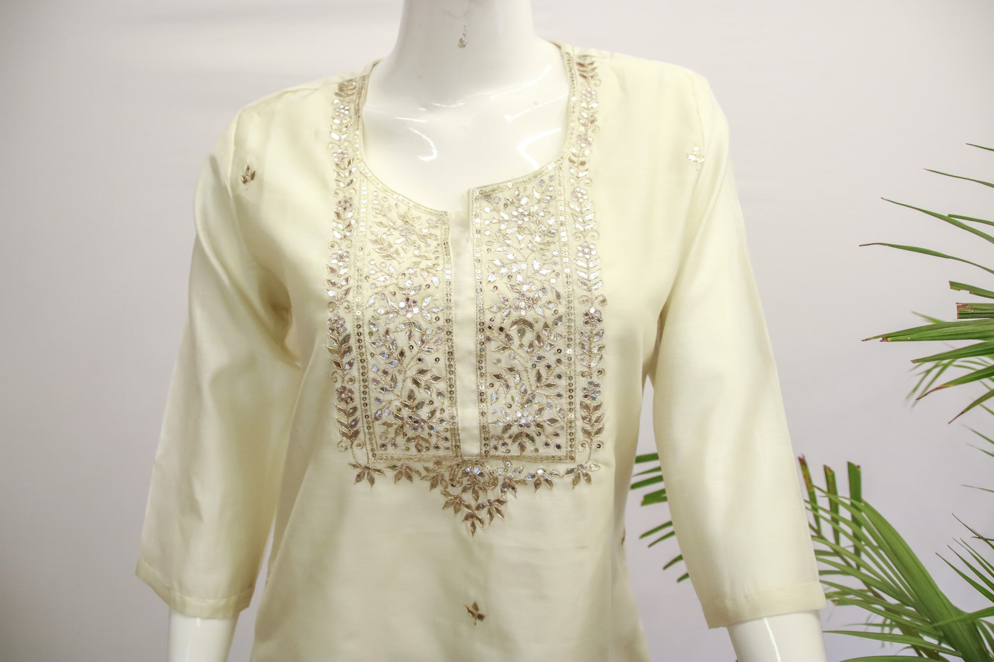 Cream Silk Kurta Set with floral print dupatta and sequin‑embellished round neck