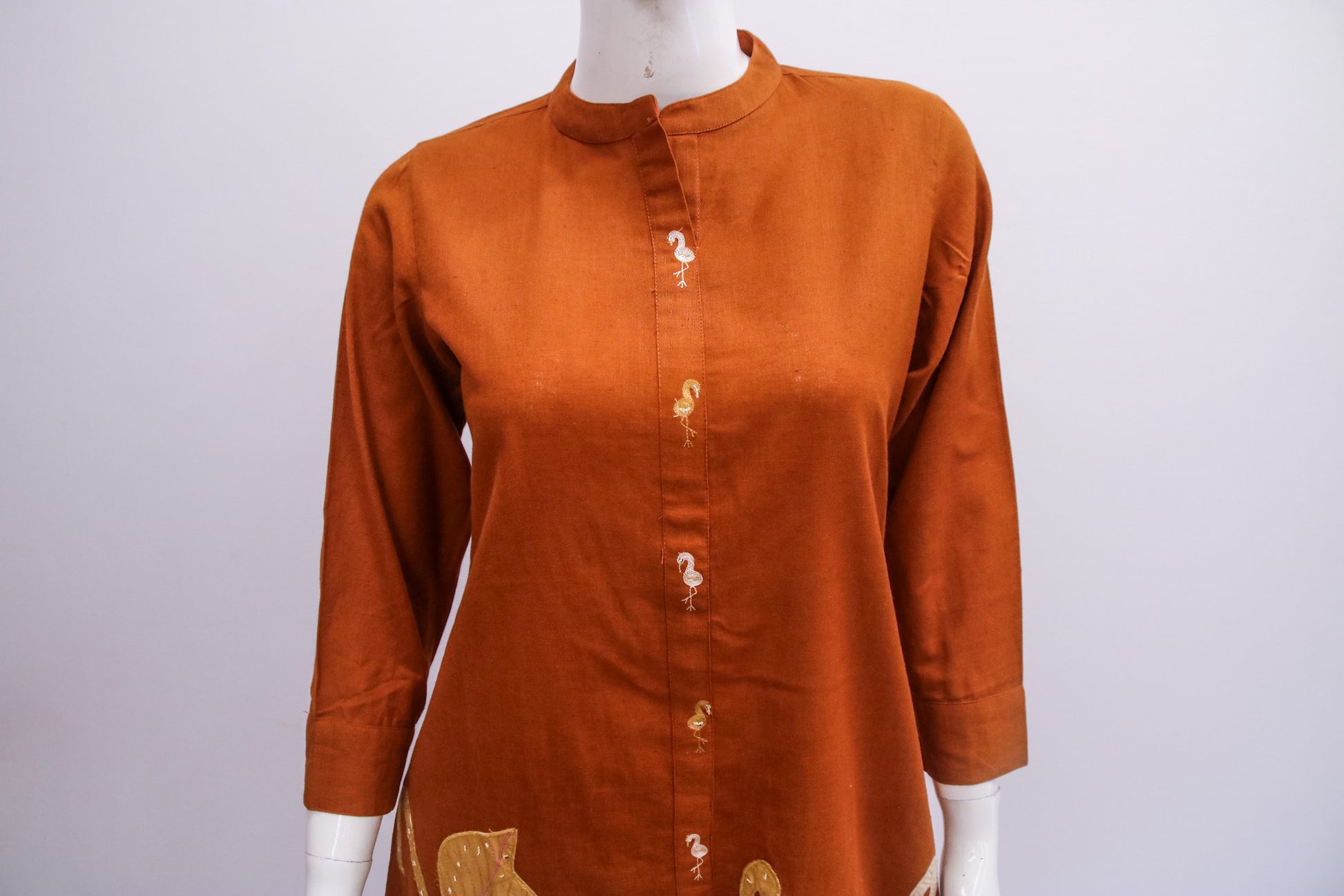 The warm rust shade adds depth and vibrance, while the tailored silhouette ensures ease of movement without compromising on elegance. Perfect for casual outings, office wear, or festive gatherings, this set blends tradition with modern minimalism.